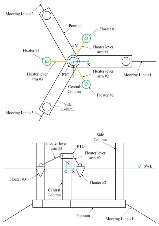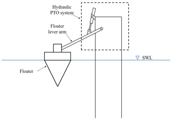 The MBAPSF consists of a 5 MW braceless semi-submersible FOWT designed by Luan [] and three Wavestar WECs []. The 5 MW wind turbine was developed by the National Renewable Energy Laboratory (NREL). The schematic diagram and main design parameters of the system are shown in Figure 1 and Table 1. Figure 2 shows the top and side views of the MBAPSF (except for the wind turbine and the tower). The braceless semi-submersible platform is composed of a center column and three side columns. The center column and the side columns are connected by buoyancy tanks. The Wavestar WEC consists of a conical floater and a steel arm, and they are arranged in a polar array around the center column. The steel arm connects the conical floater to the center column. The movement of the floating body drives the steel arm to rotate, which in turn drives the hydraulic power take-off (PTO) to generate electricity. The hydraulic PTO is shown in Figure 3. The PTO system is generally equivalent to the linear damping and stiffness in the numerical simulation [].