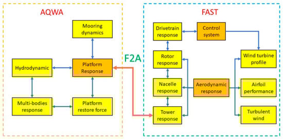 The fully coupled time-domain numerical model was constructed in this study based on the F2A simulation tool, which was proposed by Yang et al. []. As can be seen from Figure 4, the tower base load calculated by the FAST (version 7.03) subroutines is transmitted to AQWA (version 2023 R1) in the form of external force through DLL. Similarly, the platform motion response calculated by AQWA will also be transmitted back to the FAST subroutine program to determine the wind turbine aerodynamic load. More details about the fully coupled analysis tool F2A can be found in the paper published by Yang Yang et al. in 2020 []. The analysis framework of the F2A simulation tool is shown in Figure 4. This simulation tool has been used and verified by many scholars [,,,,].