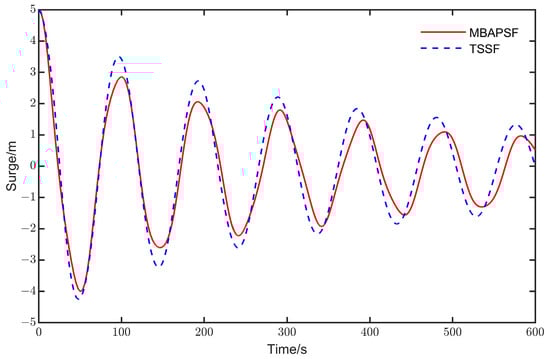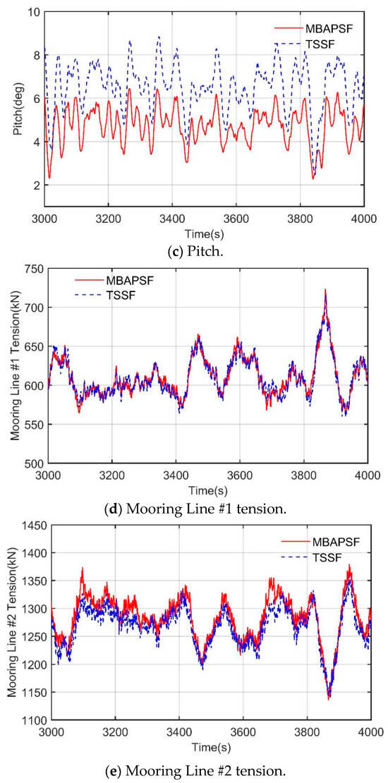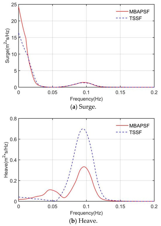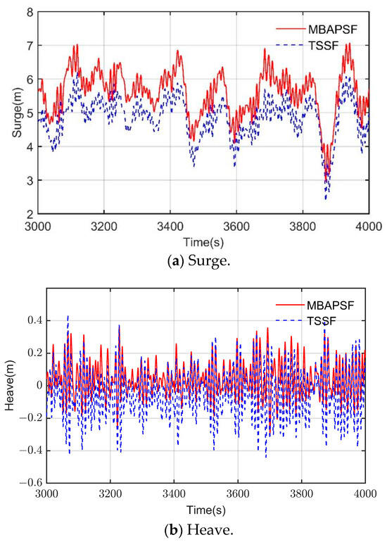 In this section, the floating platform motion responses of the MBAPSF and TSSF under different load cases (LCs) are compared and analyzed. The surge, heave and pitch are the most important DOFs for the FOWT. The total simulation duration was 6000 s. In order to avoid transient effects, the first 800 s were ignored.