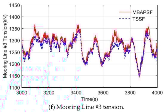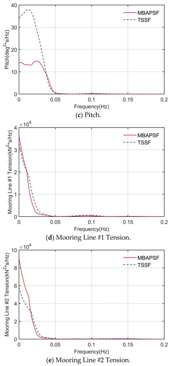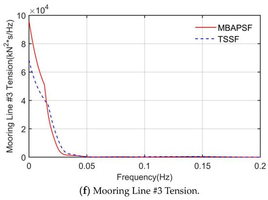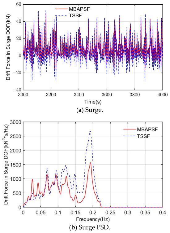 The responses of motion and mooring line tension under the operation conditions of LC2 are shown in Figure 6 and Figure 7. The drift force time histories and PSDs of the MBAPSF and the TSSF under LC2 can be seen in Figure 8. The statistical results of the platform motions and the mooring line tension in different load cases are presented in Table 6. The surge response of the MBAPSF is slightly larger than that of the TSSF, as shown in Figure 6a and Table 6. Additionally, the increase in the mooring tension of the MBAPSF was within 9% compared to the TSSF. As shown in the PSD of the platform surge and mooring lines, the WECs resulted in the increase in low-frequency responses on the MBAPSF. This is also verified in Figure 8. The drift force of the MBAPSF is larger at low frequencies compared to the TSSF. As Figure 6c and Table 6 represent, compared to the TSSF, there was a significant reduction in the pitch response for the MBAPSF. Both the maximum and mean values of the pitch motion were reduced by approximately 27% under the different environmental conditions in this paper, which means that WECs can amplify the restoring moment. As revealed in Figure 7c, the resonant response peak of the pitch motion of the MBAPSF is significantly smaller than that of the TSSF. In addition, Figure 6b and Table 6 show that WECs can restrain the heave motion of the platform, and there is an obvious reduction in wave frequency response, as shown in Figure 7b. This indicates that compared to the TSSF, there is greater restoring stiffness and damping in the heave direction for the MBAPSF.
