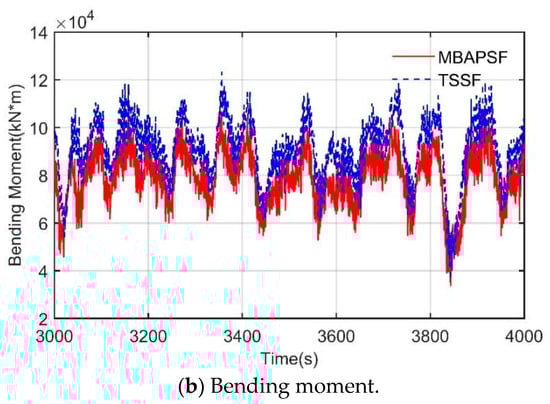 The shear force and bending moment at the tower base are the most crucial structural loads, as they easily lead to problems in structural integrity and longevity. The influences of WECs on the tower base shear force and the bending moment of the FOWT were investigated, and the results are shown in Figure 9 and Figure 10 and Table 7. Different environmental conditions were involved in this investigation, and only the dynamic responses under LC2 are presented in the figures below. It can be seen that the loads at the tower base decreased obviously under the effects of the WECs. The statistical values of the shear force and bending moment were all reduced by about 10% under different environmental loads, which is beneficial for improving the safety of the tower structure. Figure 10 reveals that the WEC had great effects on the low-frequency structural loads. The comparison shown in Table 7 demonstrates that the wind power generation capacity of the two systems is almost the same.