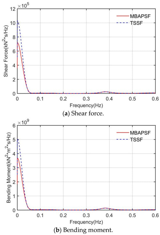 The PSDs of the tower base loads of the MBAPSF and TSSF under LC2.