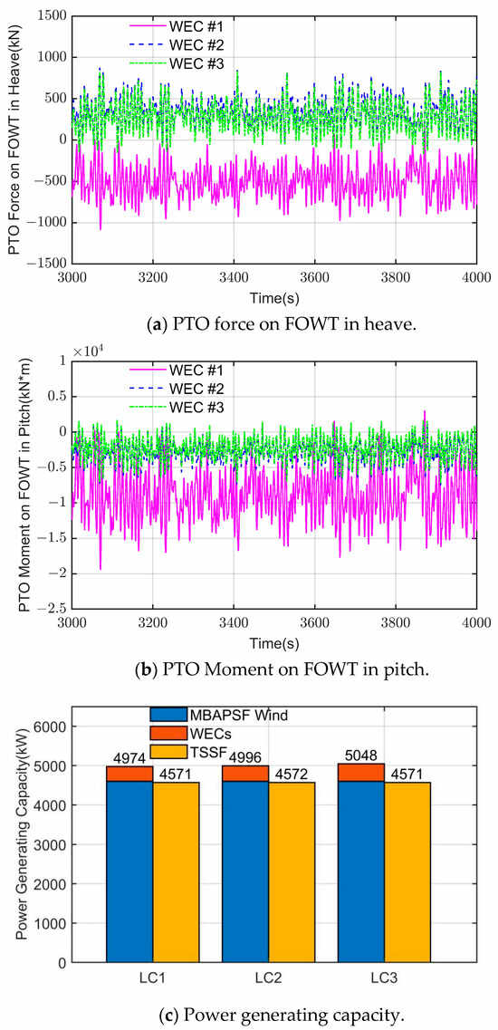 Figure 11 shows the force/moment of the PTOs applied to the heave and pitch DOFs of the platform under LC2. Table 8 shows the total power generation capacity (the sum of the wind and wave power generation capacities) of the TSSF and the MBAPSF under different environmental conditions. From Figure 11a,b, we can find that WECs arranged at different locations had different effects on the heave and pitch DOFs of the platform. For the heave DOF, the WECs arranged at the downwind side (i.e., WEC #2 and #3) provided more additional restoring force, and the WEC in the other direction (i.e., WEC #1) played the opposite role. The reason is that the large wind heeling moment generated by the wind turbine makes the pitch angle of the platform always face the downwind direction, which causes the WECs arranged in this direction to always be in a submerged condition; that is, the rotation angle of the Wavestar steel arm during movement is generally smaller than the initial angle. The opposite is true for WECs arranged in the upwind direction. For the pitch DOF, the results revealed that the WECs arranged at different positions all had an effect on decreasing the motion response of the platform, and the effect from the WECs at the upwind side was greater. The differences of the total power generation capacity between the TSSF and the MBAPSF are highlighted in Figure 10c. Compared to the TSSF, the total power generation capacity of the MBAPSF under different LC1, LC2 and LC3 conditions increased by 8.82%, 9.27% and 10.44%, respectively. It is obvious that as the wave load increases, the increase rate of the total power generation capacity of the system increases.