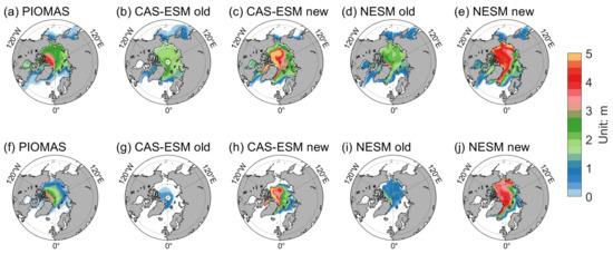 Spatial distribution of climatological (1980–2014) March (upper) and September (lower) SIT from PIOMAS (a,f), CAS-ESM2-0 old version (b,g), CAS-ESM2-0 new version (c,h), NESM3 old version (d,i), and NESM3 new version (e,j).