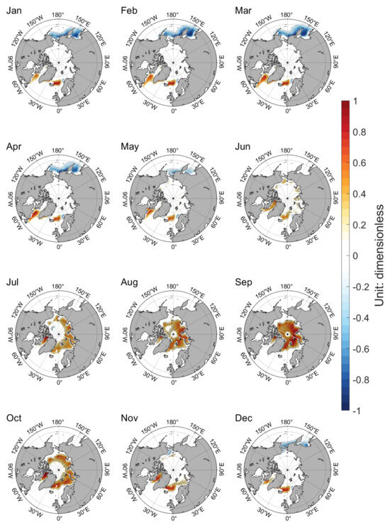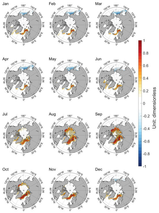 The difference of SIC with and without new schemes bears similarity between the two models (Figure 3 and Figure 4). Black dots on Figure 3 and Figure 4 represent points that are significant at a 99% confidence level for the Student’s t-test. Figure 3 shows the multi-year mean monthly SIC difference between the CAS-ESM2-0 new version and the old version from January to December (the result of the new version minus that of the old version). It can be concluded that there are two types of spatial patterns in the SIC difference of CAS-ESM2-0. From December to May, the SIC of the new version decreases in the Pacific and increases in the Atlantic. From June to November, the SIC of the new version increases in the central and marginal Arctic Ocean. Figure 4 shows the monthly SIC difference between the NESM3 new version and the old version from January to December (a result of the new version minus that of the old version). Similar to the situation of CAS-ESM2-0, from December to May, the SIC of the new version decreases in the Pacific and increases in the Atlantic. From June to November, the SIC of the new version increases in the central and marginal Arctic Ocean. Comparing Figure 3 and Figure 4, the differences in SIC from two models with and without four parameterization schemes are very similar in their spatial patterns and temporal evolutions. The results of the t-test show that the SIC changes associated with these four new schemes are significant in most regions mentioned above.