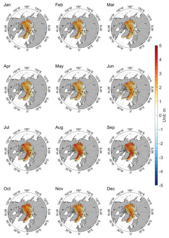 The SIT difference of these two coupled models with and without these four new schemes are also similar (Figure 5 and Figure 6). Black dots in Figure 5 and Figure 6 represent points that are significant at a 99% confidence level for the Student’s t-test. Figure 5 shows the difference of multi-year monthly mean SIT difference between the CAS-ESM2-0 new version and the CAS-ESM2-0 old version. From January to December, positive SIT difference exists in the western part of the Arctic, including Baffin Bay, Beaufort Sea, and Chukchi Sea. This spatial pattern of SIT difference shows minor seasonal variations. Figure 6 shows the difference in multi-year monthly mean SIT between the NESM3 new version and the old version. Though similar to the spatial pattern of the CAS-ESM2-0 SIT difference, a positive SIT difference exists over the entire Arctic for the NESM3 and the magnitude of the SIT difference from the NESM3 is smaller than that of CAS-ESM2-0. Comparing Figure 5 and Figure 6, it could be concluded that the difference in SIT with and without new schemes from the two coupled models is similar in that the SIT increased over the entire Arctic throughout the whole year. The results of the t-test show that the SIT differences associated with these four new schemes are significant in most regions.