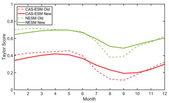 The Taylor Score (TS) provides a quantitative measure when comparing the spatial distribution of two fields. To assess the overall improvement for the entire year, TS was computed between model SIC output and SIC observation, model SIT output, and PIOMAS product. Figure 7 shows the TS value of the 1980–2014 multi-year mean SIC of the old and new versions of the two models from January to December. For the CAS-ESM2-0, the TS value of the old version has its minimum in September (red dashed line). The TS value of the new version (red solid line) is higher than that of the old version, especially in August and September. For the NESM3 model, the TS value of the old version is around 0.5 without significant seasonal variations (green dashed line) and the TS value of the new version (green solid line) with the addition of four new schemes is about 0.1 higher than that of the old version. With these new schemes, the SIC spatial distribution of the two models is improved over the entire year.