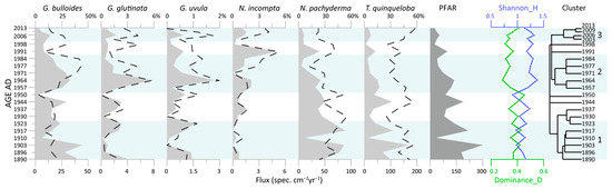 Six planktic foraminiferal species were recognised, and five of them were present in proportions of more than 5% in one or more levels: Globigerina bulloides, Globigerinita glutinata, Neogloboquadrina incompta, Neogloboquadrina pachyderma, Turborotalita quinqueloba, and Globigerinita uvula (Figure 4). The total planktic foraminiferal flux (PFAR) shows an upward decreasing trend, varying from a maximum of ca. 200 spec. cm−2 yr−1 at 1903 AD to a minimum of 25 spec. cm−2 yr−1 at ca. 2014 AD (Figure 4).