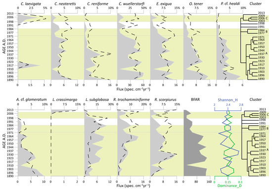 Seventy-one benthic foraminiferal taxa were identified, and twelve of them were main species. These included seven calcareous perforate taxa (Cassidulina laevigata, Cassidulina neoteretis, Cassidulina reniforme, Cibicidoides wuellerstorfi, Epistominella exigua, Oridorsalis tener, and Parrelloides cf. healdi) and five agglutinated taxa (Adercotryma cf. glomeratum, Labrospira crassimargo, Labrospira subglobosa, Recurvoides trochamminiforme, and Reophax scorpiurus) (Figure 5). The secondary species were present in proportions of less than 5% (see Supplementary Materials Table S2 and Figure S1). The BFAR reached a maximum of 141 spec. cm−2 yr−1 at ca. 1923 AD and a minimum value at ca. 1910 AD, with 17 spec. cm−2 yr−1 (Figure 5). The Shannon index (H) shows its maximum values (up to 2.73 at ca. 1937 AD) in the bottom part of the record, decreasing to a minimum value of 2.13 at ca. 1971 AD. From 1971 AD to 1987 AD, the Shannon index has high values (2.48), decreasing toward the top of the core. The dominance (D) slightly increases from ca. 1950 AD until ca. 1980 AD, reaching its maximum value of 0.225. Then, the D record becomes relatively stable, ranging between a minimum of 0.112 at ca. 1984 AD and a maximum of 0.197 at ca. 2003 AD (Figure 5).