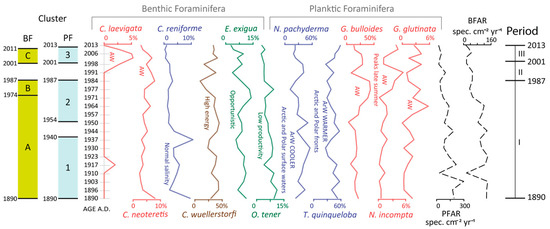 The foraminiferal assemblage of cluster B (from ca. 1975 AD to ca. 1987 AD) reveals a decreasing trend for C. wuellerstorfi, E. exigua, and O. tener, with ranges of 20 to 9%, 13 to 8%, and 9 to 4%, respectively, whereas a consistent increase was observed for the agglutinated foraminifera L. subglobosa (16 to 20%), R. trochamminiforme (9 to 16%), and R. scorpiurus (10 to 13%) (Figure 6). The BFAR is generally characterised by low values (35–51 spec. cm−2 yr−1).
