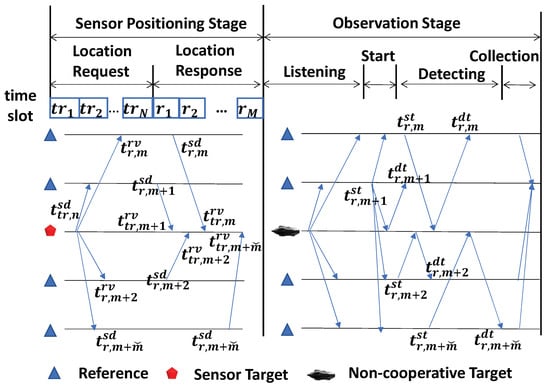 There are two stages as shown in Figure 2; one is the sensor positioning stage, during which the sensor target is located, and it can be further divided into location request stage and location response stage. The other is the observation stage, during which the non-cooperative target is located, and it can be further divided into four stages: listening, starting, detecting and collecting. Both the sensor target and the non-cooperative target are located through the round-trip TOA to reduce ranging errors caused by clock asynchronization.