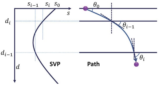 For a given SVP , where is the (i + 1)th sampling depth, is the corresponding sound speed value; the signal propagation time and horizontal distance are provided in [48] as: