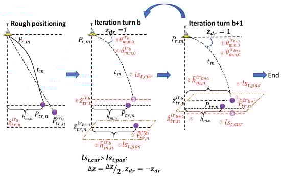 To achieve accurate positioning, we propose the IRTUL that is shown in Figure 4. At the beginning, the target node is roughly located as with a linear propagation model based on the average ocean sound speed 1500 m/s. When coming into the bth turn of iteration, based on the current positioning depth of the target node, the first step is to search the initial grazing angle of the signal through Equation (16) that exactly takes time to be transmitted from the reference node to the current target depth. The second step is to calculate the horizontal transmitted distance of the signal through Equation (17). Assume there are reference nodes; then, similar to Equation (4), there will be: