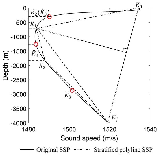 According to the derived ray tracing theory Equations (16) and (17), the complexity of calculating signal propagation time and horizontal propagation distance depends on the number of layers in the given SVP. Ray tracing is a model based on linear layering of SVP. Although the actual SVP is non-linear, when high-density sampling is performed on an SVP, the sound speed distribution between sampling points can be linearized to maintain high ray tracing accuracy. Therefore, if an SVP is reasonably linearized and simplified with a small number of sparse points, the computational cost during single sound ray tracing could be significantly reduced with a small amount of accuracy loss.