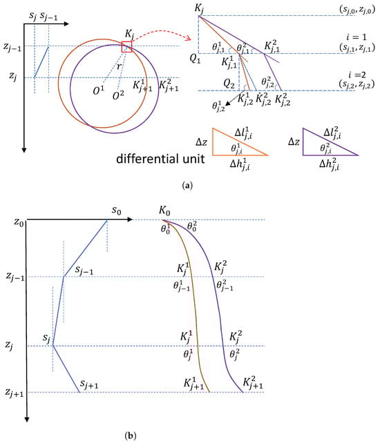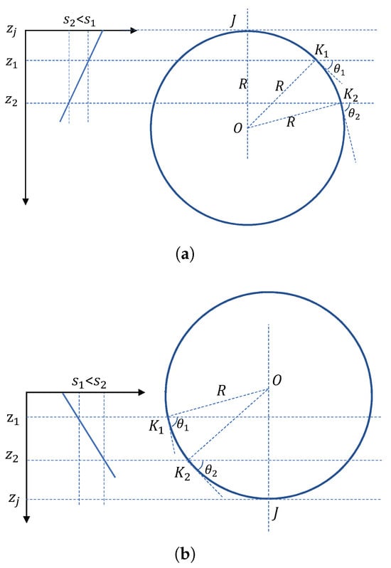 which means Equation (27) is not valid. Similarly, for any point at depth with , the same conclusion can be reached. Therefore, the signal propagation path is a segment of circle arc. Similar conclusions could be drawn in Figure 7b. In a word, for a linear layered SVP, the signal propagation path within any linear depth layer is an arc. □
