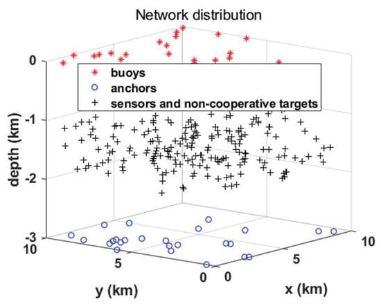 The simulation scenario is provided in Figure 9, where 25 surface buoys are uniformly distributed, and their positioning coordinates are obtained via GPS. Twenty-five anchors are also uniformly distributed at the bottom, and their location is known (obtained through positioning by buoys). Two-hundred nodes to be located are randomly suspended in water.