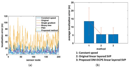 To verify the feasibility of using simplified SVPs in positioning systems, we provide localization accuracy results for different simplified methods of SVP as shown in Figure 10. The positioning RMSE errors of the total 200 sensors or non-cooperative targets are given in Figure 10a, where the curve of the proposed DM-EICPS is almost at the bottom, indicating that the simplified SVP via DM-EICPS for positioning has better accuracy performance. The average and standard deviation of localization errors by constant speed, original linear SVP and DM-EICPS simplified SVP are shown in Figure 10b. This shows that the positioning error of the simplified SVP is slightly greater than the result using the original SVP, but the difference is very small. If the number of layers in the simplified SVP is further increased, the positioning results will become closer to the positioning results by using the original SVP.