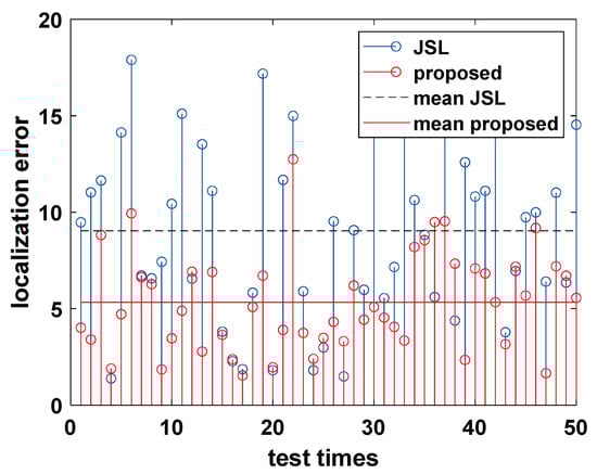 To further evaluate the accuracy performance of the proposed algorithm, we compare the localization errors under 50 times with those of JSL [22], which is given in Figure 11. The average localization error of ITRUL is 5.33 m, which has been reduced about 41% according to the average localization error 9.04 m of JSL.