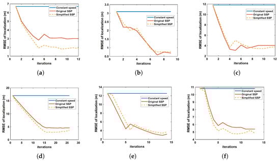 In order to verify the convergence stability of the IRTUL method, Figure 13 shows the convergence of two sets of data. It can be seen that when the number of iterations exceeds 7 and 15, respectively, in Figure 13a,b with the initial depth tuning step set to be 1, the positioning process shows convergence, and the positioning accuracy is significantly improved compared to the constant speed situation. By increasing the initial depth tuning step to 2 or 3, the convergence will be accelerated according to Figure 13c–f; however, the initial depth tuning step could not be set too large as the convergence performance will not be stable and smooth as shown in Figure 13e,f.