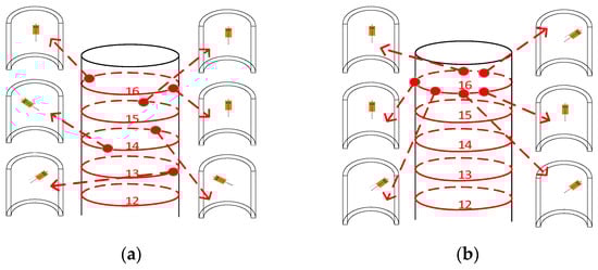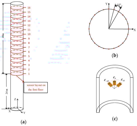 Layout of sensors on the tower structure. (a) Sensor arrangement along the height direction; (b) sensor arrangement in the circumferential direction; (c) sensor arrangement on the inner wall of towers.