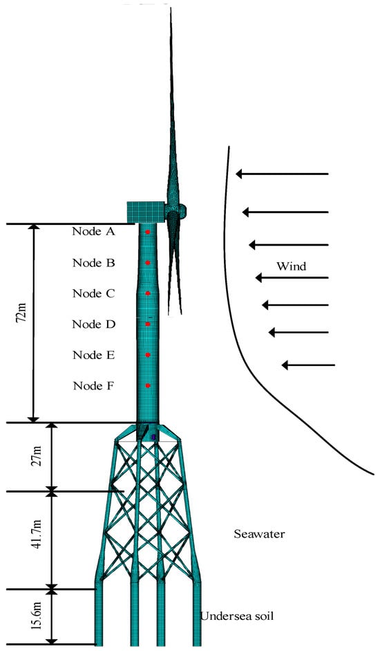 An offshore jacket wind turbine is composed of a jacket foundation, tower, and turbine unit. Ideally, it is assumed that the structural response generated by wind loads at the top of the tower is collected by strain sensors placed on the inner wall of the tower structure, which does not align with reality. Both wave loads and wind loads acting on the surface of the tower, as well as wind loads at the tower’s top, contribute to responses within the tower segment, meaning the structural response captured by actual sensors results from the combined effects of multiple loads. The influence of wave loads and wind loads acting on the tower’s surface on the sensor-collected data is analysed below.