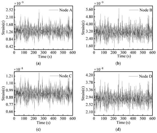 The JONSWAP spectrum [36], a model designed to characterise the energy distribution of sea waves, is employed. Utilising the chosen wave parameters, this study conducts wave condition simulations within the Ansys Aqwa environment based on the JONSWAP spectrum for the defined maritime area. The calculated wave load was then applied to the FEM of the entire wind turbine structure, initiating a transient dynamics analysis to determine the structural response of the entire system under the wave load. The first principal strain data for the six nodes of the tower structure is shown in Figure 4.