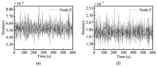Strain range of nodes on the tower drum. (a) First principal strain versus time curve at Node A; (b) first principal strain versus time curve at Node B; (c) first principal strain versus time curve at Node C; (d) first principal strain versus time curve at Node D; (e) first principal strain versus time curve at Node E; (f) first principal strain versus time curve at Node F.