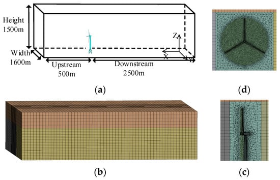 The computational domain’s dimensions were meticulously defined for simulations with Ansys Fluent 2022 R1, as illustrated in Figure 5a, to closely mimic realistic environmental conditions. The domain’s extensive span of 3000 m in length, 1600 m in width, and 1500 m in height, with 500 m upstream and 2500 m downstream, was chosen based on preliminary tests to ensure minimal boundary effects on the simulation results. Figure 5b–d showcase the finite volume models, illustrating a comprehensive approach to capturing the complex fluid dynamics around the turbine. The inlet wind speed, crucial for accurate load simulation, was determined using Equations (20) and (21). Simulations conducted at a granular 0.01 s time step over 100 s offered high-resolution insights into the wind load dynamics. Post-processing involved considering the tower’s top generator set and fan blades as a mass point to streamline the analysis without compromising accuracy.