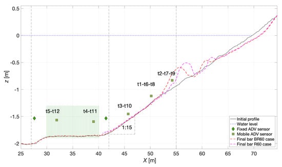 Cross-profile positioning of all sensors deployed in the BR60 and R60 layouts (see text for details). The small squares and small circles represent successive positions of mobile trolley stations, showing how all sensors are repositioned every 30 min after the end of each wave set. The meadow is represented by green vertical lines on the flat part of the flume.
