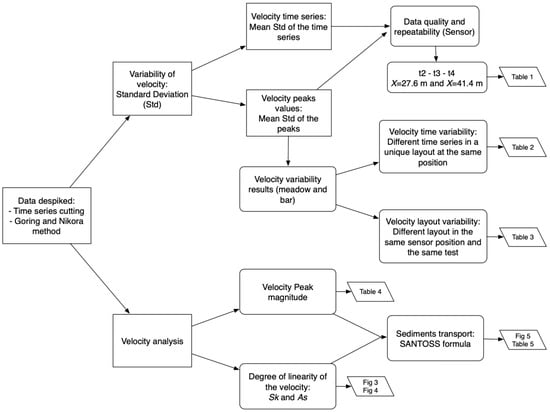 The data processing was carried out according to the diagram in Figure 3. All ADV time series were processed, and spike noise was eliminated using the method developed by []. The time interval between 0.5 and 25.5 min was considered, discarding the initial and final values of each series (Time series cutting). The velocity values were cleaned after considering the amplitude, signal-to-noise ratio, and correlation of the acquired signal. All values that presented an amplitude value lower than 75, a signal-to-noise ratio lower than 15 dB, and a correlation lower than 70% were discarded, and NaN values were inserted into those time series. In addition, velocity values that exceeded 4 times the standard deviation of the average for the series were eliminated following the works of [,].