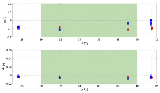 Illustration of skewness (Sk) and asymmetry (As) variation (bottom and top panel respectively) for measuring stations between X = 27.6 m and X = 41.4 m. Red diamonds represent the BR60 layout and blue circles represent the R60 layout. The lighter shades represent the initial tests, and the darker shades represent the final tests, as detailed in Figure 2. X = 31.9 m corresponds to measurements at t5 and t12, while X = 39.1 m corresponds to measurements at t4 and t11. The green area represents the meadow zone located between X = 30 m and X = 40 m.