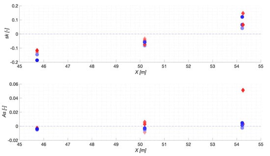Illustration of skewness (Sk) and asymmetry (As) variation (bottom and top panel respectively) for measuring stations between X = 45.7 m and X = 54.2 m. Red diamonds represent the BR60 layout, and blue circles represent the R60 layout. The lighter shades represent the initial tests, and the darker shades represent the final tests, as detailed in Figure 2. X = 45.7 m corresponds to measurements at t3 and t10, while X = 50.1 m corresponds to measurements at t6 and t8, and X = 54.2 m corresponds to t2, t7, t9.