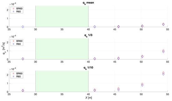 The qs values were calculated taking into account the mean velocities, the average of the highest one-third velocities (1/3), and the average of the highest one-tenth velocities (1/10) at each position shown in Figure 6 (X = 27.6, 41.2, 45.7, 50.2 and 54.2 m). The calculated net transport was onshore at all positions and increased gradually as one moved towards the coast and according to the magnitudes of the velocities studied. The sediment transport capacity was lower for the meadow layout (R60, blue diamonds in Figure 7), except for the first measurement position found in front of the meadow. The percentage decrease in sediment transport capacity obtained for each position is shown in Table 6. Although a significant reduction in sediment transport capacity was observed at the positions from X = 27.6 m to X = 50.2 m (bold values in Table 6), it is important to note that transport in this area experiences substantially lower magnitudes if we compare it with positions beyond X = 54 m.