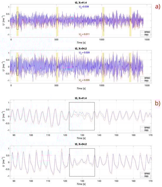 (a) Time series of u in Test 2 for positions X = 41.4 m (upper panel) and X = 54.2 m (lower panel), indicating with a yellow rectangle the major divergences found in the whole series. The BR60 layout is shown in red and the R60 layout in blue. The Uc values for the whole t2 series are presented in the figure, keeping the colors of each layout for consistency. (b) Details of a case of velocity divergence (black dashed lines in Figure 7a,b) between 125 and 135 s.