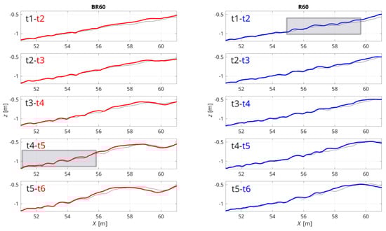 Sand profile evolution for BR60 (left panels) and R60 (right panels) experimental layouts. Black lines indicate the profile evolution for the initial test comparison, while red and blue lines indicate the profile evolution for the subsequent test comparison for BR60 and R60, respectively. The grey areas indicate the occurrence of megaripple-like bedforms in each layout.