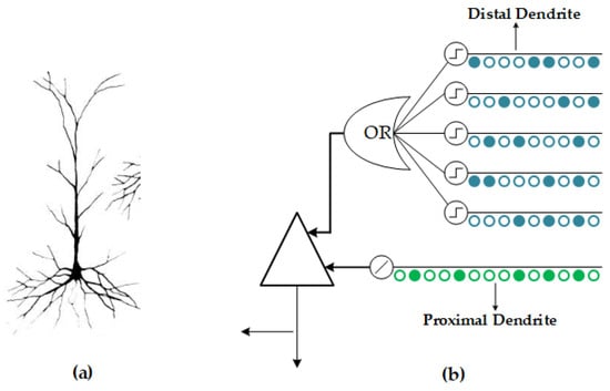 (a) Biological neuron; (b) Hierarchical Temporal Memory (HTM) cell.