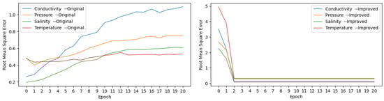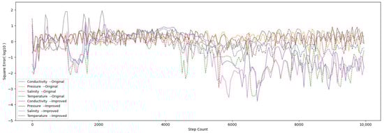 The prediction error of the original HTM decreased initially but later exhibited an upward trend for the temperature and pressure data, achieving their minimum values at iteration 1; meanwhile, the conductivity and salinity curves repeated at iteration 0, with marginal variance from iteration 1. Considering the HTM’s capability for online learning, the pretraining iterations of the original HTM model were set to 1. Compared to the original version, the improved HTM model maintained a consistent level of accuracy and model stability for iterations exceeding 2. Consequently, the pretraining iterations for the improved HTM model were set to 2.