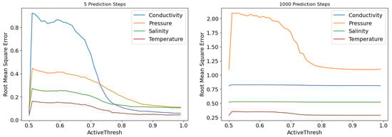 On the one hand, the weight matrices of GRU are initialized using the “setRandom” function from Eigen, which assigns random values between 0 and 1. On the other hand, the number of active synapses in the dendritic segments of the HTM are always greater than or equal to the value of zero. Combining these factors with the properties of the “sigmoid” and “tanh” functions, it can be inferred that the output of the GRU will always fall within the range of 0.5 to 1, setting the values for “μ” accordingly. The prediction errors on temperature, pressure, conductivity, and salinity data at 5 and 1000 time steps are calculated under different values of “μ” and presented in Figure 7.