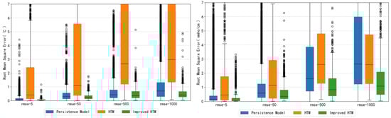 To further assess the enhanced capability of the improved HTM model in capturing complex long-term dependencies in time series data, we additionally added a persistence model to the error estimation. It uses the actual values at time to predict the values at time , and the RMSE is calculated for the three models using temperature and conductivity data. The calculations are conducted for time steps of 5, 50, 500, and 1000 with the results presented in the form of boxplots in Figure 9. It is evident that the improved HTM consistently demonstrates smaller maximum error, average error, and median error compared to the persistence model and original HTM. These findings indicate a significant enhancement in the stability and the short- and long-term predictive performances of the improved HTM model in time series data compared to the original HTM.