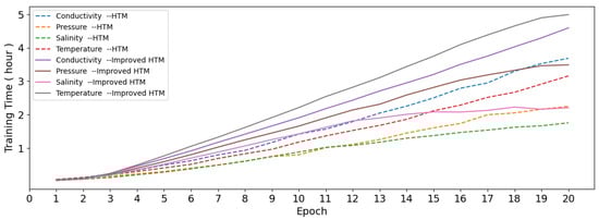 Despite the adoption of C++ to enhance computational efficiency, the improved HTM model requires more time to complete the same number of iterations with a training set containing 10,000 data points (as shown in Figure 10). The increase in training time varies from 22% to 105%, depending on the characteristics of the data and the number of iterations.