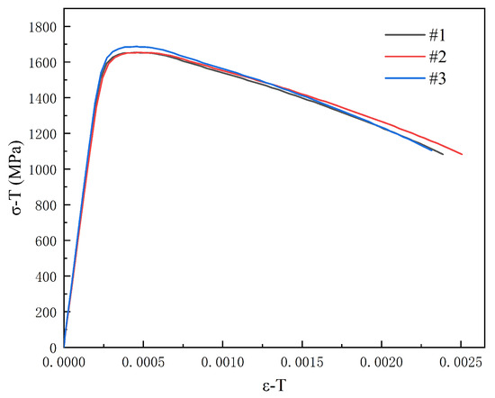 Table 1 shows the chemical composition of the 18Ni (250) maraging steel tested in this study. The sample size is shown in Figure 1, where L is the standard distance of the sample. In this test, L = 50 mm is taken. The sample was processed by wire cutting, and then the working section of the sample was polished to Ra = 0.2 using SiC sandpaper. To determine the mechanical properties of 18Ni (250), tensile tests were carried out at room temperature according to the national standard [18]. The yield strength , Young’s modulus E, Poisson’s ratio , elongation A and section shrinkage Z of the sample were measured in the test. The entire test was conducted on an MZ-50001D1 computer-controlled universal material test machine (Shenzhen Wan test equipment Co., Ltd., Shenzhen, China). To make the experimental results universal, the test was carried out three times on sections of three samples with dimensions of 12 mm × 3.97 mm, 12 mm × 3.96 mm, and 12 mm × 3.97 mm. The three samples selected were numbered #1, #2, and #3. Table 2 shows the test measurements, and Figure 2 shows the measured stress–strain curve.
