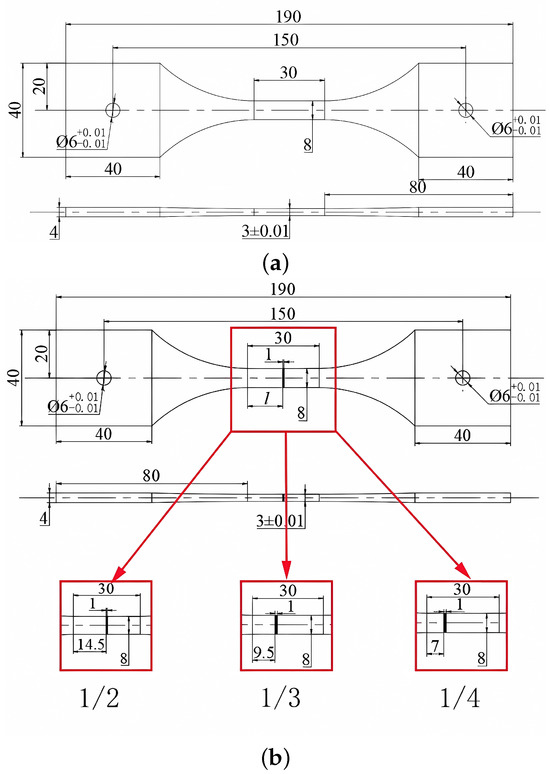 The sample used in the constant-amplitude fatigue test was designed according to the national standard [19]. The dimensions of the designed sample are shown in Figure 3a,b. Four types of samples were used, with dimensions of 190 mm × 40 mm × 4 mm. The sample was processed by wire cutting, and then the working section of the sample was polished to Ra = 0.2 using SiC sandpaper. The welding joint adopts non-bevelled double-sided automatic butt welding and adopts ER410NiMo wire as filling material without post-welding heat treatment.
