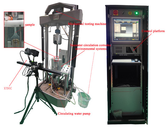 Figure 4 shows the equipment used in the corrosion fatigue test. The tensile fatigue tests were carried out by WANCE high- and low-temperature–corrosion environment coupling mechanical testing machine HDT105A (Shenzhen Wan test equipment Co., Ltd., Shenzhen, China). A seawater circulation corrosion environment was created using natural seawater with a PH of 8.4, which met the requirements for simulated marine environments. Data were collected during the fatigue crack test using a three-dimensional full-field strain measurement and analysis system (XTDIC) produced by the XTOP Company (Shenzhen, China). The camera in the device had a pixel size of 3.45 m and a frame rate of 70 fps and was used to observe and capture the crack initiation process in the sample. First, according to the standard [21]. a constant-amplitude sine wave was selected as the load control for the fatigue test. Second, considering the duration of the test and the actual working conditions, the loading frequency was set at 5 Hz. The maximum load in the test was set to a certain proportion of the maximum theoretical load. If a crack was not initiated after 1 million sample cycles, loading was terminated. Finally, the loading coefficient was adjusted according to the measured results to determine the fatigue life under different stress levels.