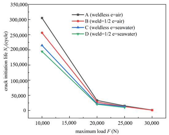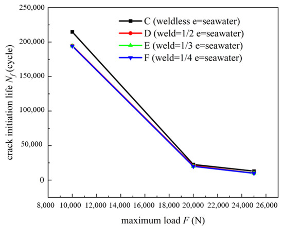 Figure 6 shows the effect of the weld positions on the crack initiation life. The crack initiation lives of the samples in Group C differ considerably from those of the other three groups; There are only small differences among the crack initiation lives of the samples in Groups D, E, and F. For example, the difference between the crack initiation lives of samples from Groups C and D is 21.5% at 25,000 N but only 1.6% between the crack initiation lives of samples from Groups D and F at 25,000 N. These welded samples have different crack initiation lives, but the fracture location is not located at the welding joint in these samples. Therefore, the following conclusions can be drawn. First, under the same welding conditions, different weld positions lead to different stress distributions in the samples, resulting in different corrosion fatigue crack initiation lives of the samples, but the effect is relatively small. Second, considering the corrosion fatigue crack initiation lives of the samples with and without the welding joint shows that a welding joint strongly influences the corrosion fatigue life of a sample. Third, all the welded samples are not fractured at the weld position but near the weld position, possibly because of the effect of high-temperature heat sources during fusion welding. The structure and properties of the heat-affected areas close to both sides of the welding joint are changed, which leads to a decrease in the corrosion fatigue crack initiation life of the whole sample.
