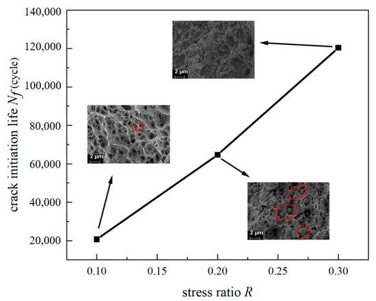 Figure 7 shows the corrosion fatigue crack initiation life and corresponding fracture morphology of a sample in the corrosive seawater environment under a maximum load F = 20,000 N and stress ratios R of 0.1, 0.2, and 0.3. The red area in the figure is the small crystal particles on the microscopic morphology. The stress ratio R strongly affects the crack initiation life of the sample during constant amplitude fatigue cyclic loading. The crack initiation life increases considerably with R. The microscopic particles on the specimen surface increased significantly with the gradual increase in R, indicating that the role of corrosion gradually increased. The crack initiation life determined at a stress ratio of 0.3 is 5.8 times that determined at a stress ratio of 0.1. This result is obtained because the minimum stress increases and the stress amplitude decreases when the stress ratio R is increased under a constant maximum load F. The Goodman formula is given below.