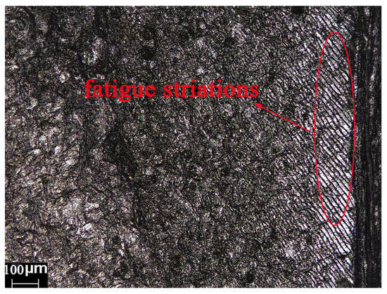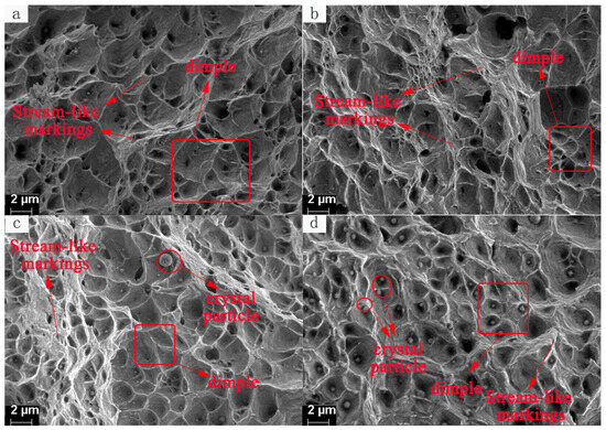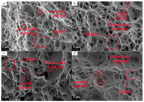 The entire fracture failure process of the sample can be divided into three stages: crack initiation, crack propagation, and fracture tearing. The fracture region can be divided into a fatigue region and a transient fracture region. Crack initiation occurs in the fatigue region, so the observation area of these micromorphology is the fatigue region. It can be seen from Figure 9 that the fracture surface is mixed with some fatigue striations. These micromorphologies shown in Figure 10, Figure 11 and Figure 12 all the correspond to dimple fractures. According to the microfracture mechanism, crack initiation and microcrack propagation in 18Ni (250) belong to dimple fracture. A dimple fracture is a fracture produced by the accumulation and interconnection of micropores under the action of external forces.