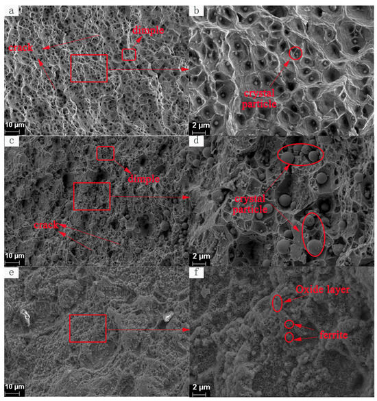 Figure 12 shows the morphology of the corrosion-fatigue fracture of samples with different stress ratios in the seawater environment, where Figure 12b, Figure 12d and Figure 12f are enlarged images of local regions in Figure 12a, Figure 12c and Figure 12e, respectively. With an increasing stress ratio, there is an increase in the crack initiation life and corrosion time in the seawater environment, as well as a prominent increase in the number of crystal particles on the fracture and an increase in the volume. In Figure 12e,f, the microscopic morphology shows there is an abundance of flat acicular martensite formed by the growth of small crystal particles. The macro-fractures of this group of samples are filled with a reddish–brown oxide. It can be inferred that the crystal particles that appear in the fracture morphology are the products of the redox reaction of the sample in the corrosive seawater environment. This indicates that the effect of seawater corrosion on crack initiation of equivalent samples is increasing with the increase in stress ratio. From the ferrite observed in Figure 12c, it can be seen that the element undergoing the REDOX reaction may be iron.