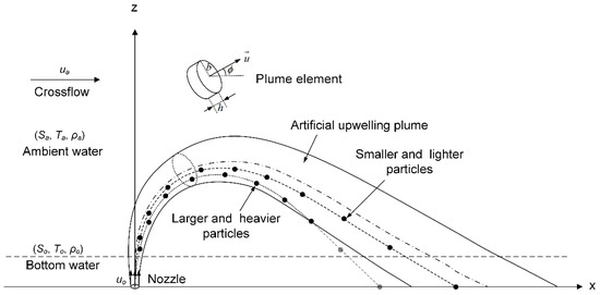The upwelling plume can deliver particulate organic waste, and its deflection in the crossflow determines the transport and fate of the particles. Particulate waste typically does not follow the movement path of the upwelling plume precisely; its movement is affected by multiple factors, including the density, shape, and size of the particulate waste [22]. Generally, smaller and lighter particles can be transported over more extensive distances within the plume.