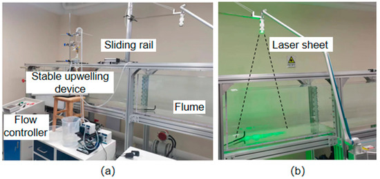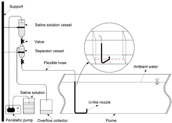 The experiments were conducted in a transparent flume (5 m long, 0.4 m wide, and 0.5 m deep) in the PIV Laboratory of Hainan Institute, Zhejiang University. The flume was equipped with a flow generation system with a continuously adjustable flow rate to achieve a crossflow velocity of up to 0.15 m/s. AU was simulated by discharging a saline solution vertically upwards from the bottom of the flume. For the discharge of the saline solution, a stable upwelling device was designed [32], as shown in Figure 3, which mainly consisted of a saline solution vessel, a separator vessel, an overflow collector, and a U-like nozzle. The liquid in the separator vessel could be steadily injected into the flume vertically upwards under the effect of water pressure difference through the U-like nozzle.