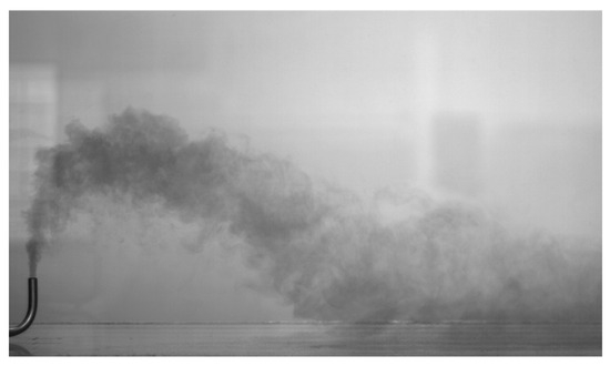 Figure 8 shows a comparison between the numerically calculated particle trajectories (white lines) and the experimentally taken particle dispersion images. The instantaneous plume velocity contained the time-averaged velocity and its fluctuations, i.e., the pulsating velocity. The numerical model only considered the time-averaged flow field of the plume to obtain the mean trajectory of the particles. In contrast, the experimentally recorded particle dispersion contained turbulent diffusion characteristics of particles deviating from the mean trajectory under the influence of pulsating velocity.